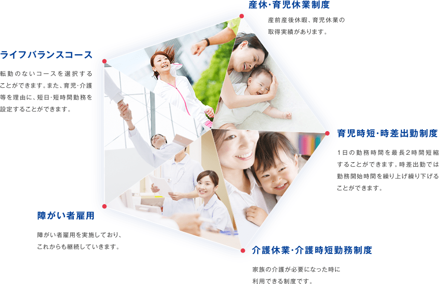 転勤のないコースを選択することができます。また、育児・介護等を理由に、短日・短時間勤務を設定することができます。